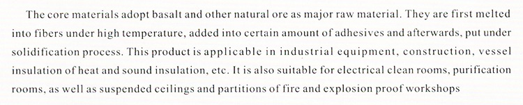 其芯材是以玄武岩及其它天然矿石等为主要原料,经高温熔融成纤维,加入适量粘结剂,固化加工而制成的。该产品适用于工业设备、建筑、船舶的绝热、隔音等,同时适用于电子洁净房、净化房、防爆 防火车间吊顶、隔断等。